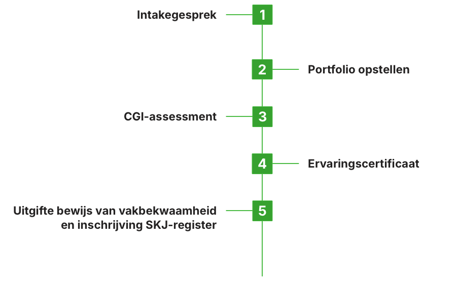 Het EVC-traject volgt een helder stappenplan van intakegesprek tot certificering. Iedere fase wordt professioneel begeleid, zodat je weet waar je staat en wat er van je verwacht wordt. De tijdlijn is flexibel en kan worden aangepast aan jouw persoonlijke situatie en beschikbaarheid.